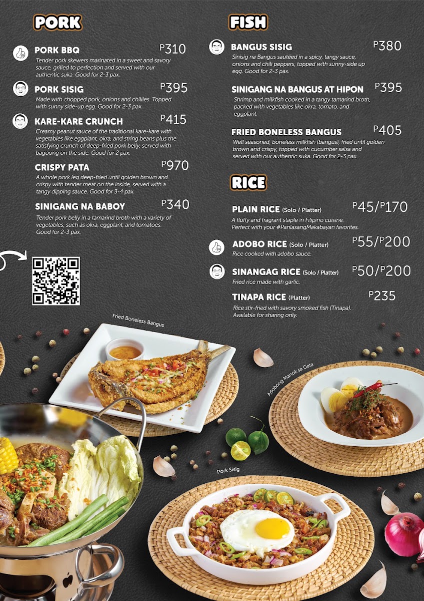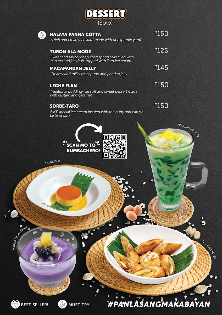 This includes various breakfast favorites like: Chicken Adobo Chicken Tocino Beef Tapa Corned Beef Longganisa (choice of Batutay or Recado) Fried Bananas Fried Eggplant Served with Sinangag Rice, KT Salsa, your choice of scrambled or sunny side-up eggs, 3 dipping sauces & 3 cups of coffee.